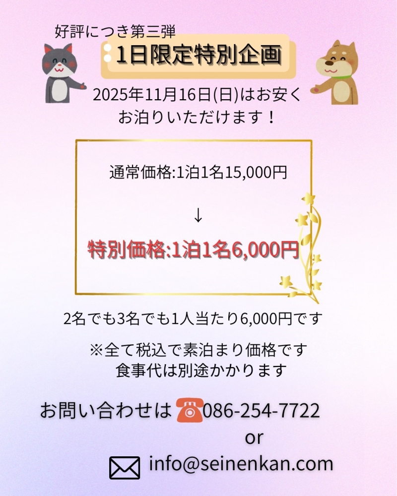11月16日(日)の1日限定でお安くお泊りいただけます。 通常価格:1泊1名15,000円→特別価格6,000円! (2名、3名でも1名あたり6,000円となります) 是非この機会に当館をご利用くださいませ。 ※すべて税込で素泊り価格です。 お食事代は別途かかります。
