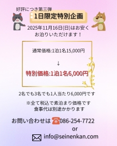 11月16日(日)の1日限定でお安くお泊りいただけます。 通常価格:1泊1名15,000円→特別価格6,000円! (2名、3名でも1名あたり6,000円となります) 是非この機会に当館をご利用くださいませ。 ※すべて税込で素泊り価格です。 お食事代は別途かかります。 |