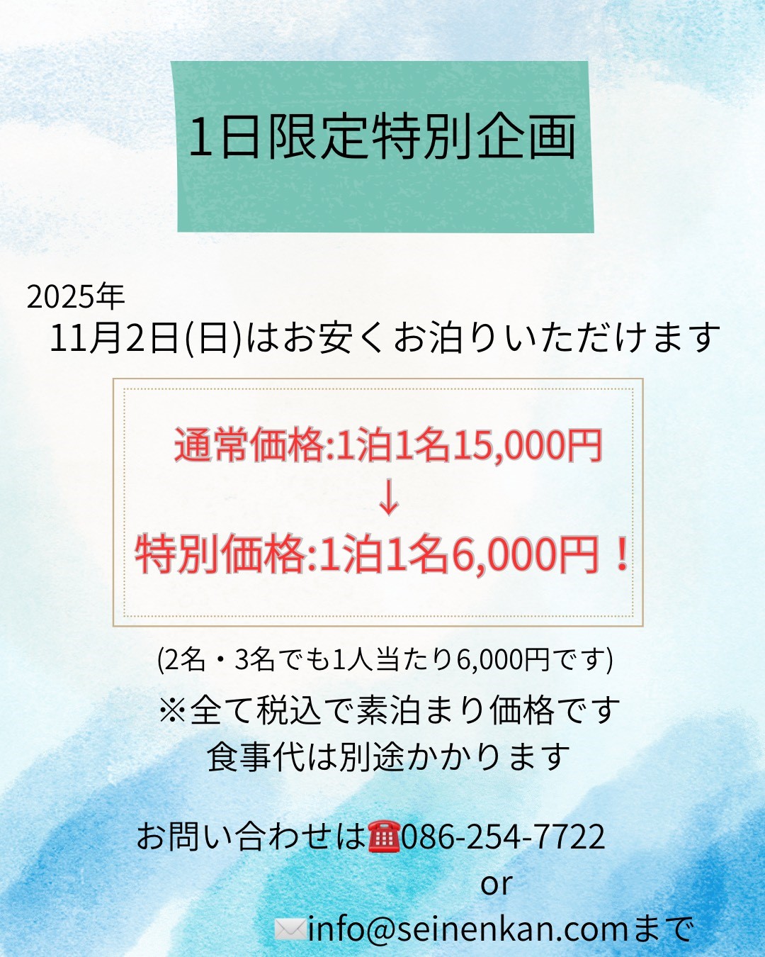 11月2日(日)の1日限定でお安くお泊りいただけます。 通常価格:1泊1名15,000円→特別価格6,000円! (2名、3名でも1名あたり6,000円となります) 是非この機会に当館をご利用くださいませ。 ※すべて税込で素泊り価格です。 お食事代は別途かかります。 |